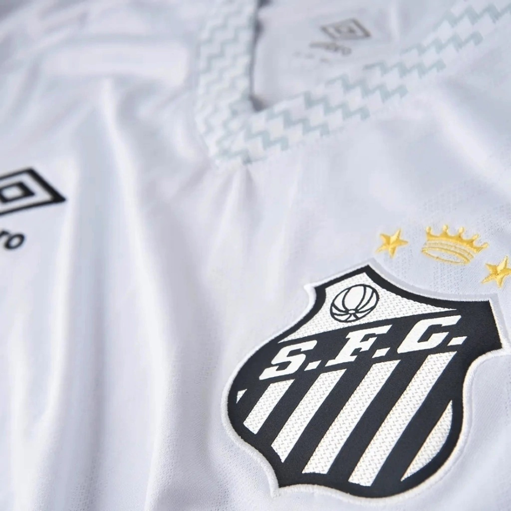 A Camisa Masculina Umbro Santos Oficial 1 2025 Torcedor traz elementos em seu design que são inspirados na Escadaria de Santos, com grafismos na gola que remetem ao icônico ponto turístico.