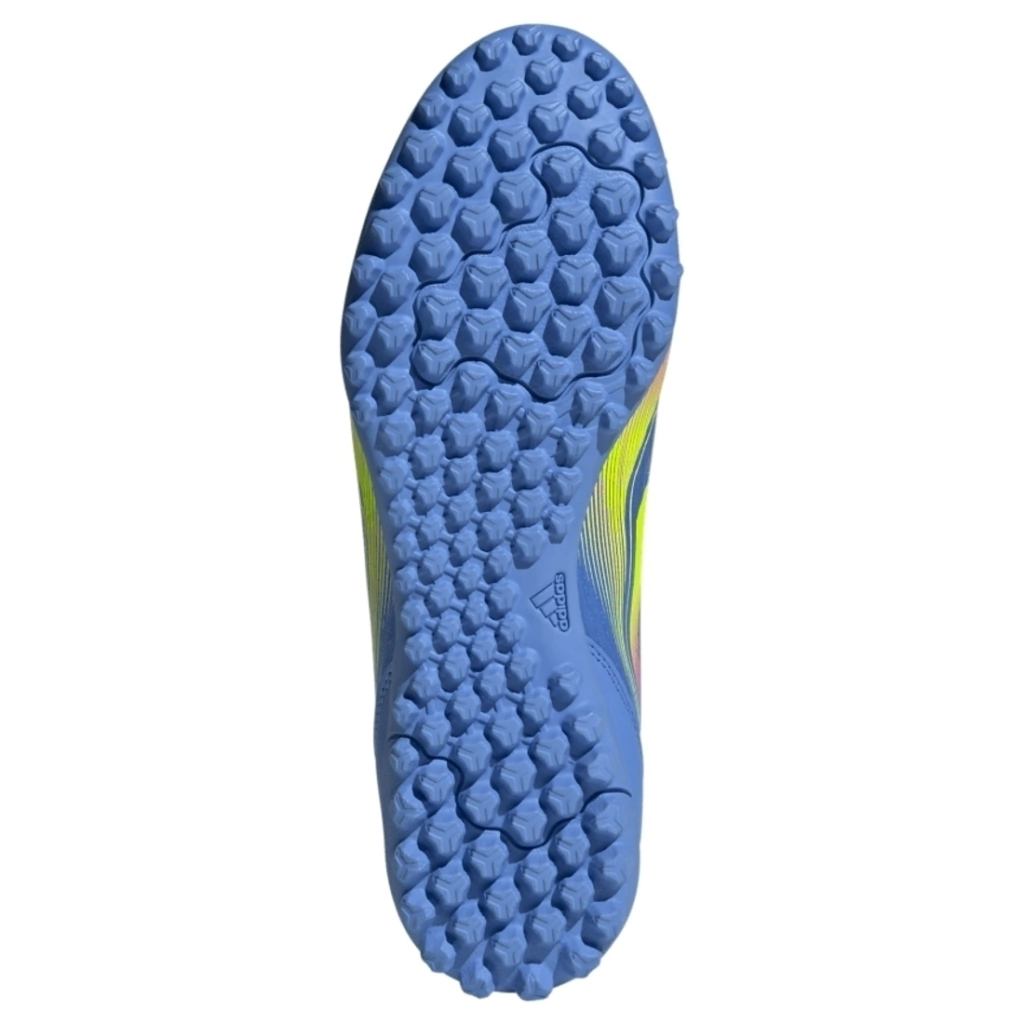 Por baixo, o solado de borracha sulcado impulsiona você para jogos de alta velocidade em superfícies artificiais de society.
