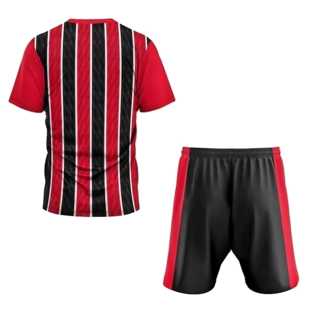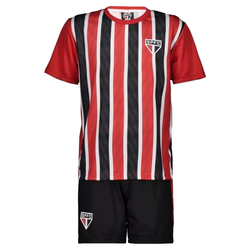 Composto por uma camisa e um calção, ambas as peças são confeccionadas em poliéster, além de contar com o escudo do clube estampado em destaque.